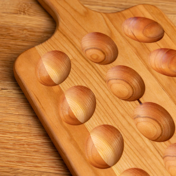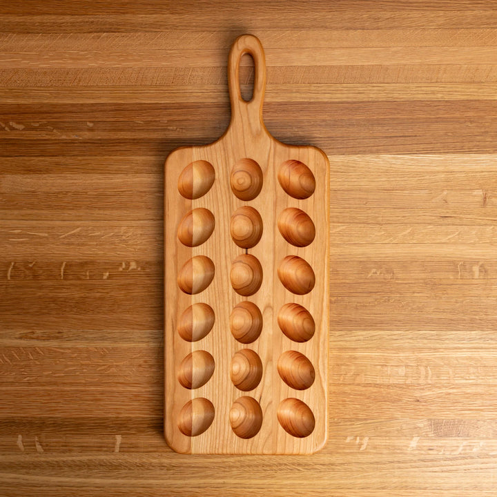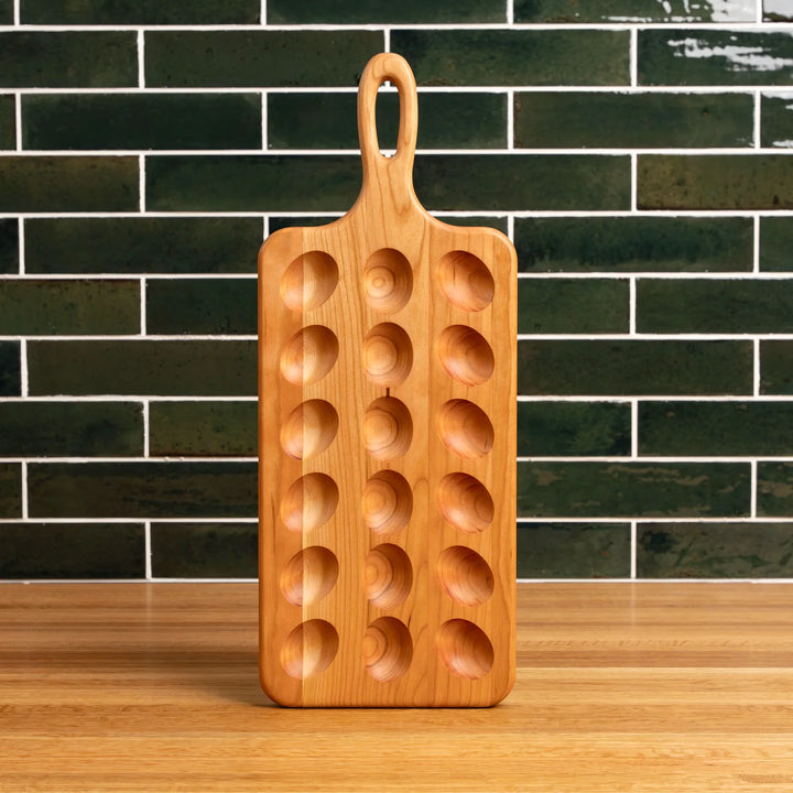 Impress your guests with this Cherry Deviled Egg Tray, perfect for any party. Designed to hold 18 eggs, ideal for gourmet deviled egg tray and other appetizers. The tray can also be used as a serving plate by simply turning it upside down. Great multifunctional piece for any kitchen.