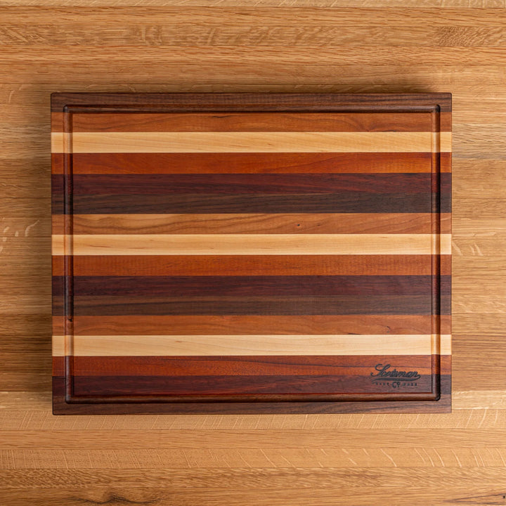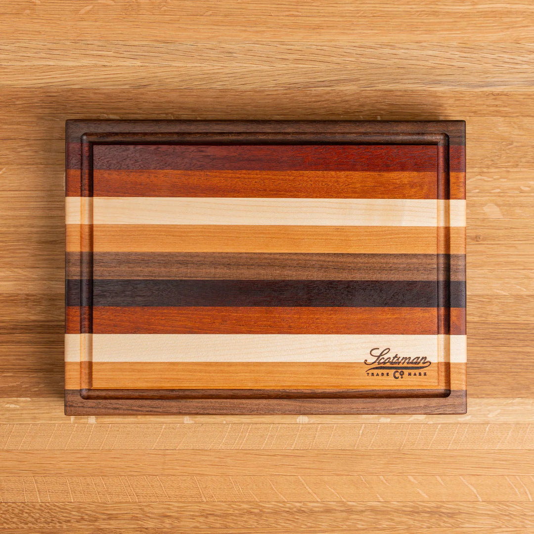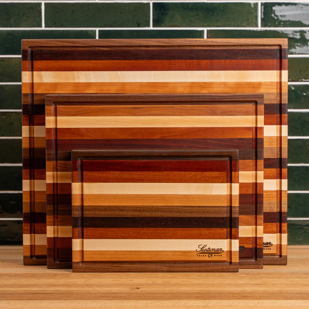 This edge grain butcher block is made using Maple, Walnut, Cherry, Jarrah and Mahogany. A great piece that combines all the beautiful wood in one board and would make the perfect addition to any kitchen.