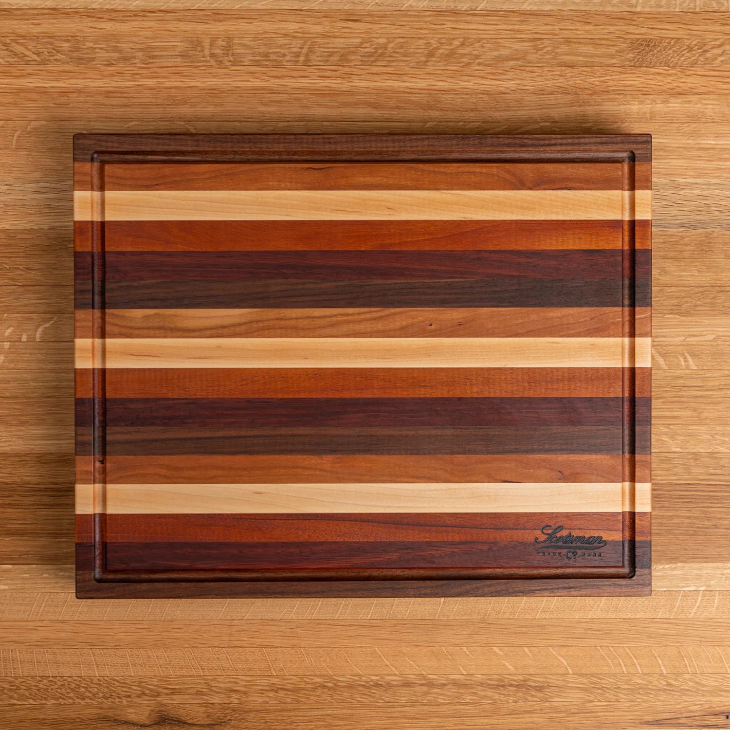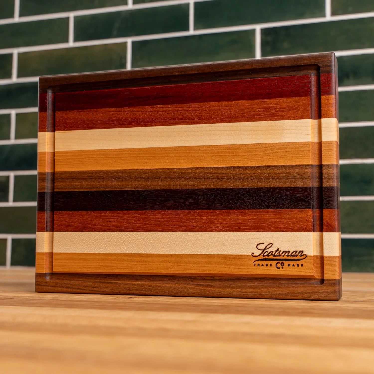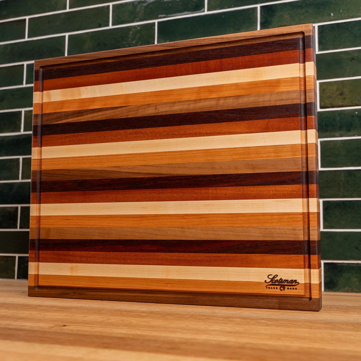 This edge grain butcher block is made using Maple, Walnut, Cherry, Jarrah and Mahogany. A great piece that combines all the beautiful wood in one board and would make the perfect addition to any kitchen.