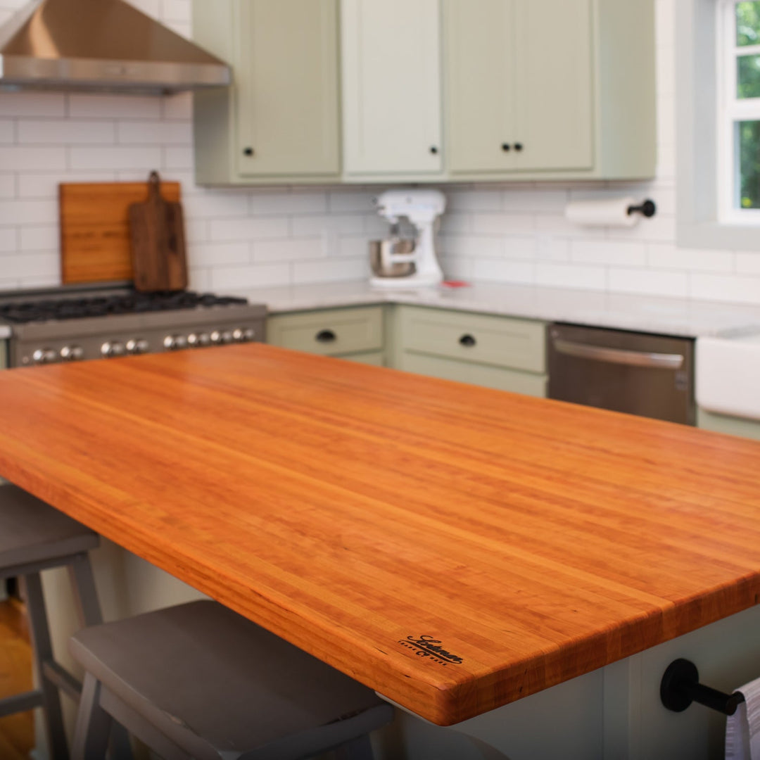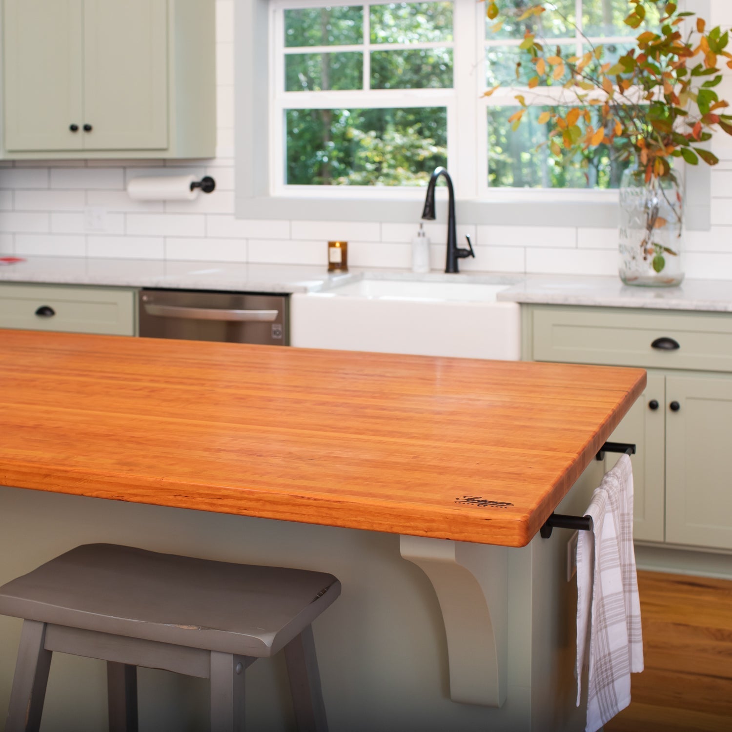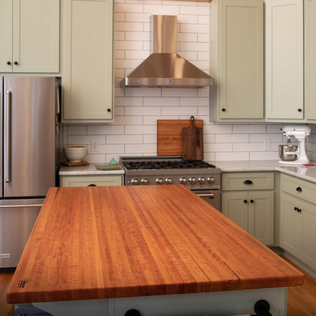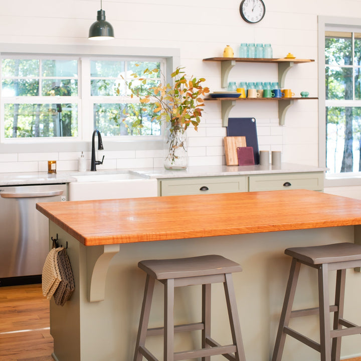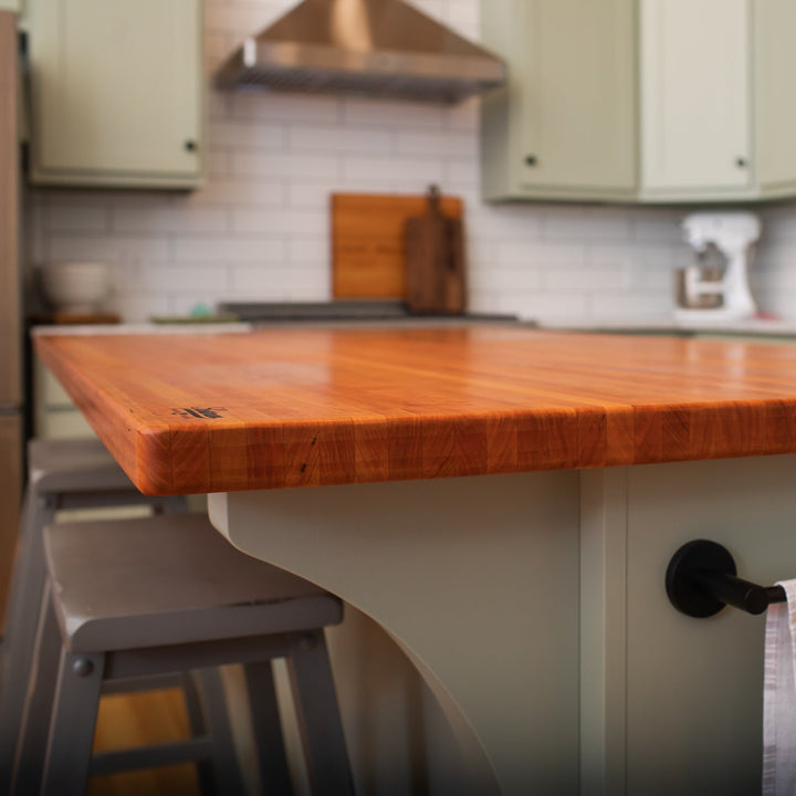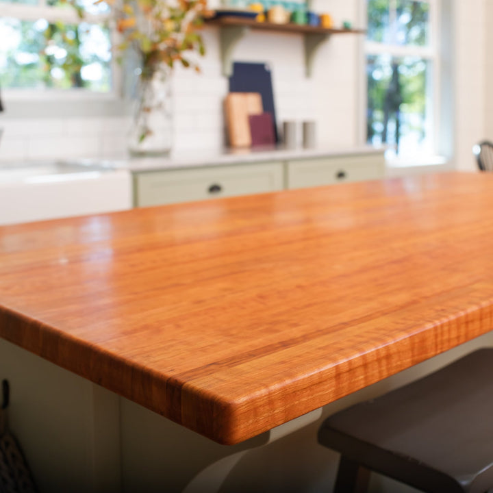 Pro tip: An oil finish means the wood grain is more exposed to nicks and scratches, but this allows for easy repair sanding and quick touch-ups. Great for heavy-use islands where the marks of use lend to the warmth of the home like historic butcher blocks.