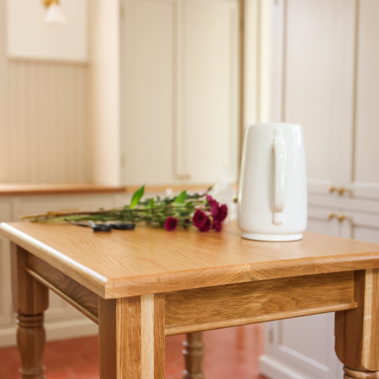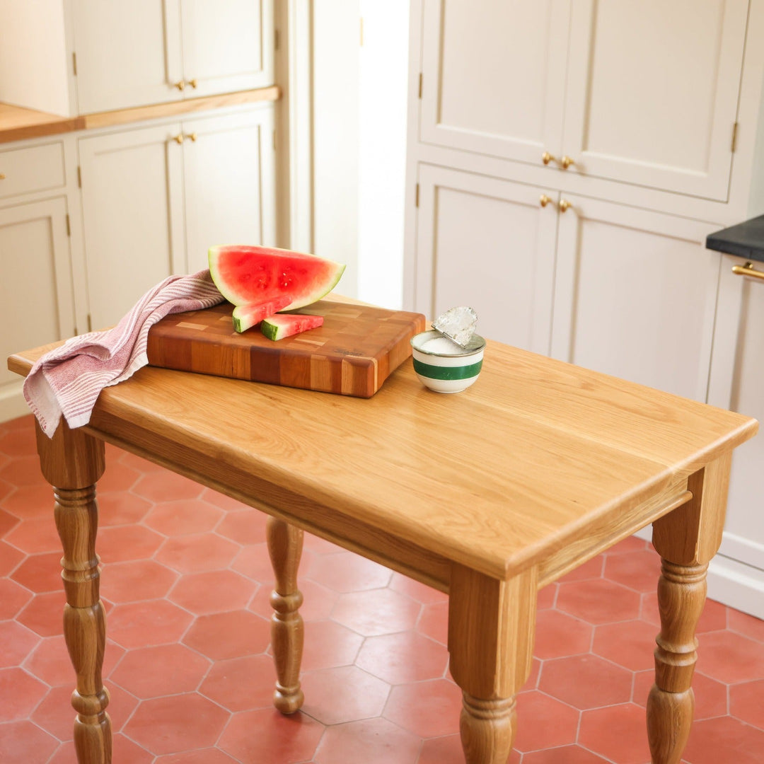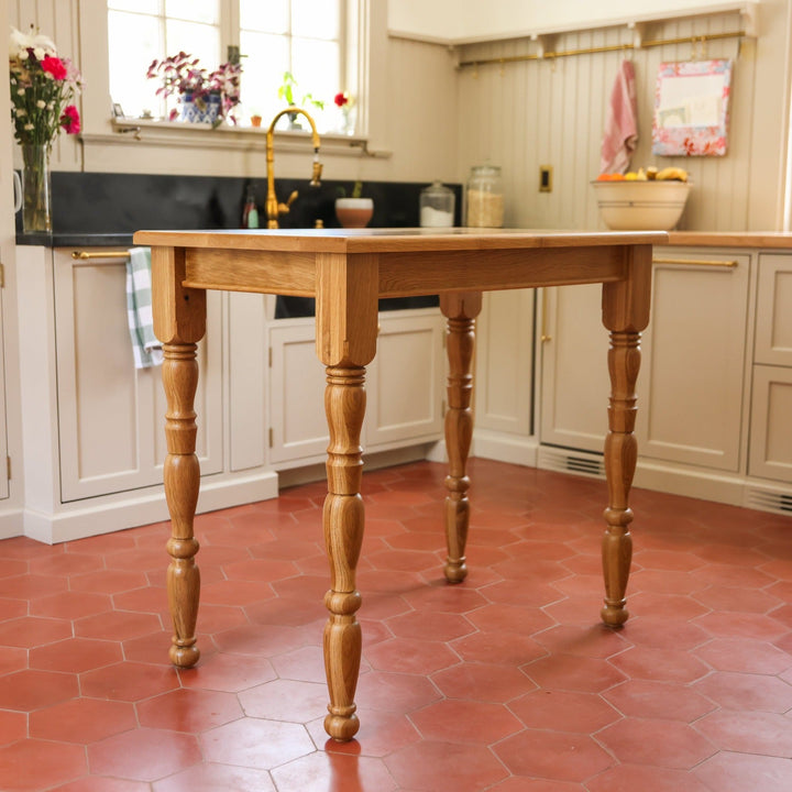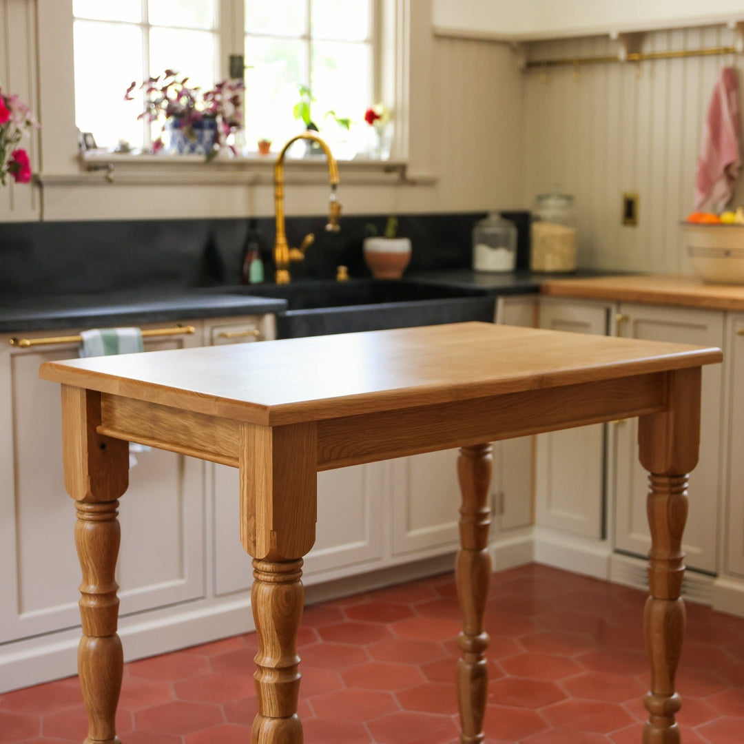 Bring a piece of Home Town into your home with this beautifully designed White Oak Island Chef Table. The design is inspired by the simple, elegant, durable food prep islands often found in historic French and English country homes and reminds us of something you might find downstairs in the kitchen at Downton.